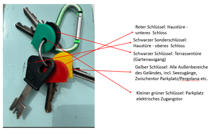 Durch Grundstückstor durchgehen (gelber Pfeil) mit gelbem Schlüssel (für alle Außenanlagen) (roten Pfeil ignorieren :-)